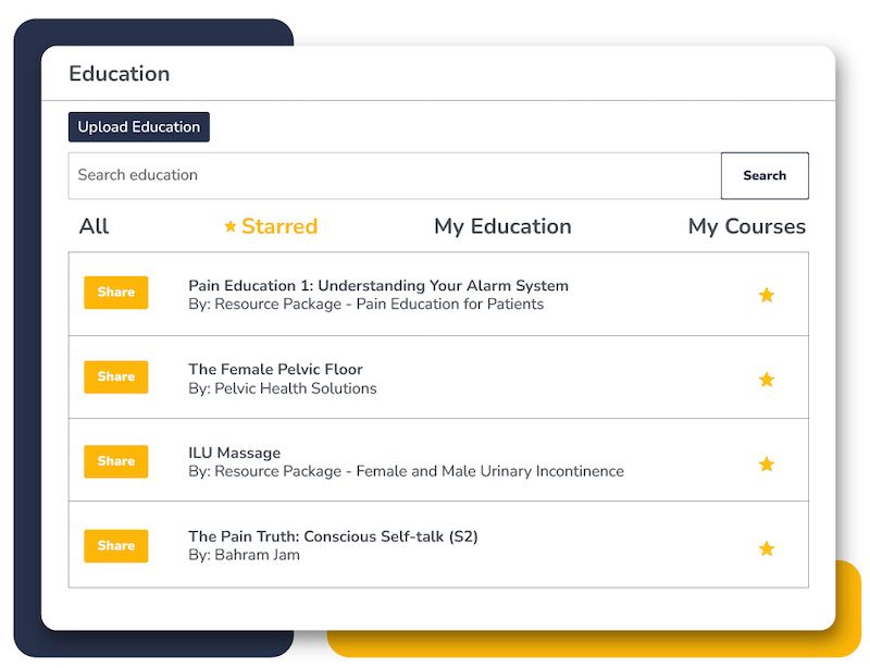 Share educational content with your patients that support what they learned in session. Select from Embodia’s library, including content from top clinical instructors, or upload your own. Create text, image, or video-based educational content!